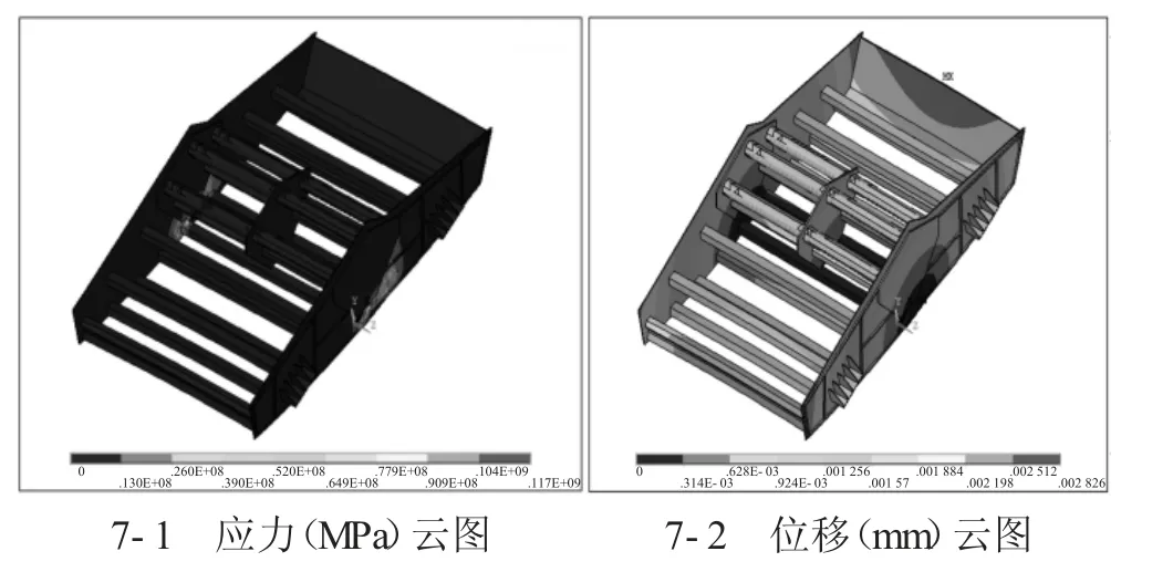 同时,还给出了对应频率26 Hz下的优化结构后的香蕉型振动筛的应力应变云图,如图7所示,可看出其最大应力值为117 MPa,低于材料的强度极限,因此,优化后的香蕉型振动筛在工作状态下,其优化后的结构设计完全满足要求,不会出现横梁断裂或开裂的情况,可以保证香蕉型振动筛的正常使用。