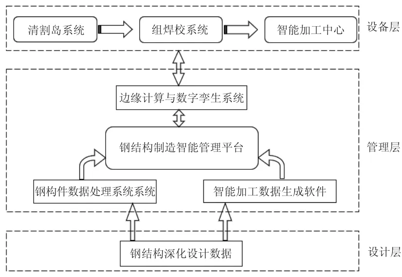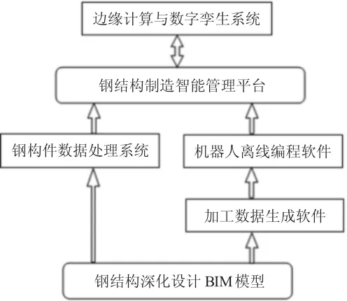 如图5所示,为确保设计、生成和管理的全程互通,实现真正的智能自动化,开发“钢构件数据处理系统”和“智能加工数据生成软件”,采集钢结构深化设计端的BIM数据,上传至“钢结构制造智能管理平台”进行归集管理;通过“边缘计算与数字孪生系统”将管理平台上的加工数据下发至产线设备,指导整个生产线的运行;“边缘计算与数字孪生系统”实时采集设备运行数据并呈现出设备实际运行状态,对实际运行数据分析处理,将处理后的加工数据即时下发回产线设备、并上传至“钢结构制造智能管理平台”进行归集管理;从而实现了从设计层—管理层—设备层数据的传递、管理与交互。