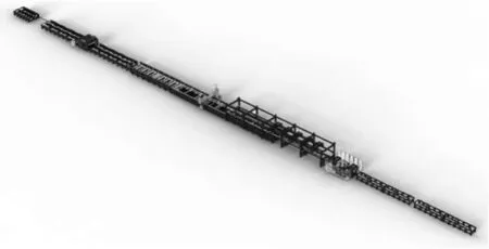 1 智能生产线下页图1所示即为智能生产线,由“清割岛”系统(下页图2)、“组焊校”系统(下页图3)和智能加工中心(下页图4)组成,“清割岛”是智能生产线的前端备料工序,包括表面处理单元、条板切割单元、桁架搬运单元和清边倒角单元,其功能是将钢板加工成后续所需的条板。“组焊校”是智能生产线的主要工序,包括进料、组立、埋弧焊、除渣、翻转、矫正和锯切等单元,通过各个单元的整体协调以完成H型钢的生产。智能加工中心是钢结构智能装配加工一体化工作站,工作站内切割机器人负责对主构件进行等离子切割,完成开锁口、割圆孔、开坡口等工作,搬运机器人负责辅板上料和自动定位,焊接机器人负责辅板焊接,伺服变位机配合三台机器人协同工作,完成零部件的定位组装,形成装配式钢结构构件。
