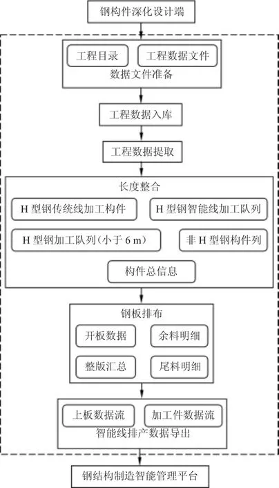 钢构件数据处理系统(见图8),可对多个工程项目的钢构件设计数据进行归并处理,提取出符合H型钢智能自动化生产线加工范围的钢构件;对归并后的构件数据按截面和长度进行最优排产组合,并对最优排产下的条板进行下料排版,最终形成所需的构件排产数据流,为H型钢智能自动化生产线的有效运行提供数据支持。
