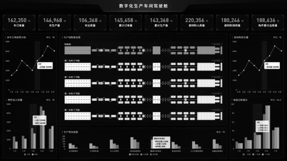 传统钢结构加工管理粗放,一般还采用简单的excel表格来对项目订单、加工任务、工作量统计等进行管理,存在效率低、信息不及时、统计困难等缺点,管理人员无法第一时间得知加工车间的实际情况。针对上述信息化管理不足,项目研发一套契合钢结构制造智能管理、高度集成化和模块化的生产管理系统(见图9),辅助智能线的生产需求,同时将工厂内传统生产线统一管理,协同排产,将车间整体生产能力最优化,管理可视化。