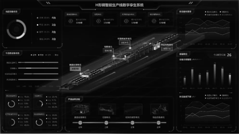 通过Janus边缘计算平台实现了数字模型与智能产线之间的信息交互。数字孪生系统(见下页图10)实时采集设备运行数据并呈现出设备实际运行状态,并对实际运行数据的分析处理,将优化处理后的加工数据即时下发回产线设备、并上传至“钢结构制造智能管理平台”进行归集管理;从而实现了从设计层—管理层—设备层数据的传递、管理与交互。
