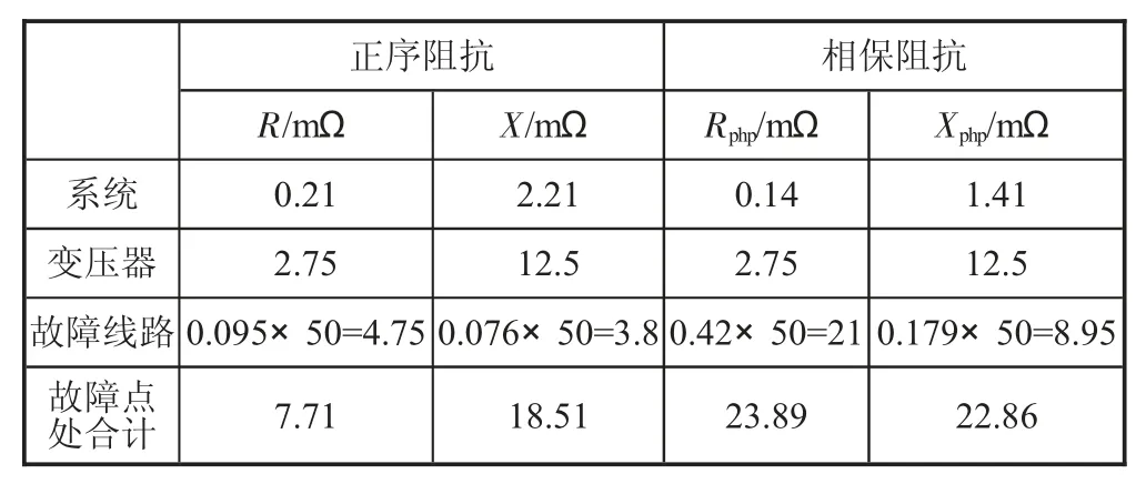 母线阻抗很小,忽略不计,其余各部分相保阻抗查《工业与民用配电设计手册》(第四版)[1]表4-21、表4-23和表4-25,如表1所示。