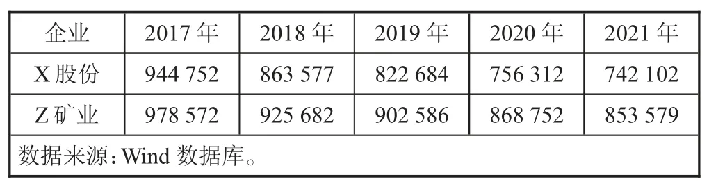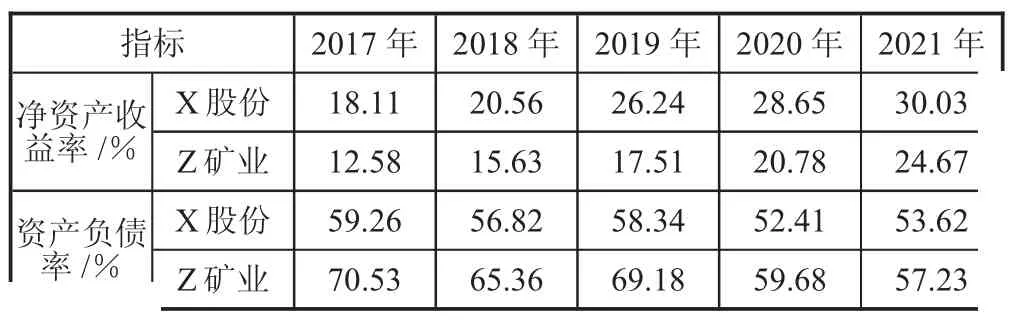 由表3 可知,2017—2021 年,X 股份与Z 矿业的净资产收益率均呈现稳健上升趋势,而资产负债率处于波动中下降状态。客观来看,产能闲置与企业运营风险实为一脉相承,互为表里,而企业运营风险主要可以结合偿债状况与盈利状况做出分析。供给侧改革背景下,采矿企业多采用“低成本多元化”的转型策略,通过并购重组优质目标企业,强化资源筹备利用率,获取先进的技术或管理理念,补足自身的业务短板,拓宽产业布局。X 股份与Z 矿业的偿债能力与盈利能力均有所提升,资产管理效率水平有明显的改善。