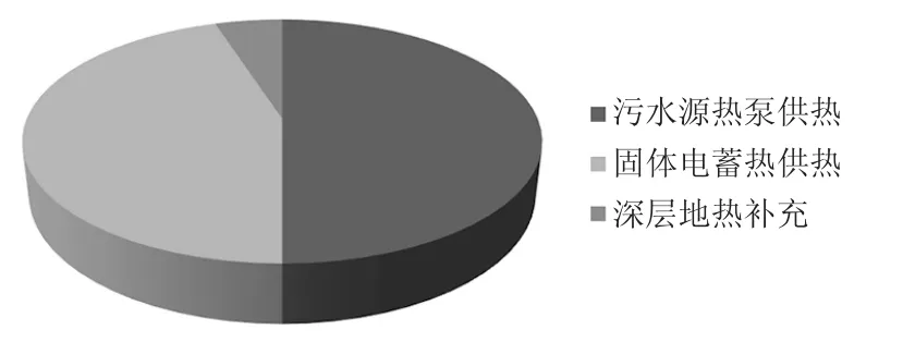 2 能源分类禀赋及热负荷分配2.1 供能形式项目能源方式设计采用“电蓄热锅炉调峰+复合式再生水源热泵供热供冷系统+电蓄热锅炉调峰+中深层地热资源补充”的。其中再生水源热泵系统提供厂区50%的基础热负荷,负责把回水温度从40 ℃加热到55 ℃;电蓄热锅炉串联运行,负责将水温从55 ℃加热到80 ℃,负担45%的调峰热负荷,在严寒期采用深层地热水进行混水补充,预计负担5%的热负荷。具体见图1。夏季采用电蓄热机组蓄热供热,热泵机组供冷的运行模式。