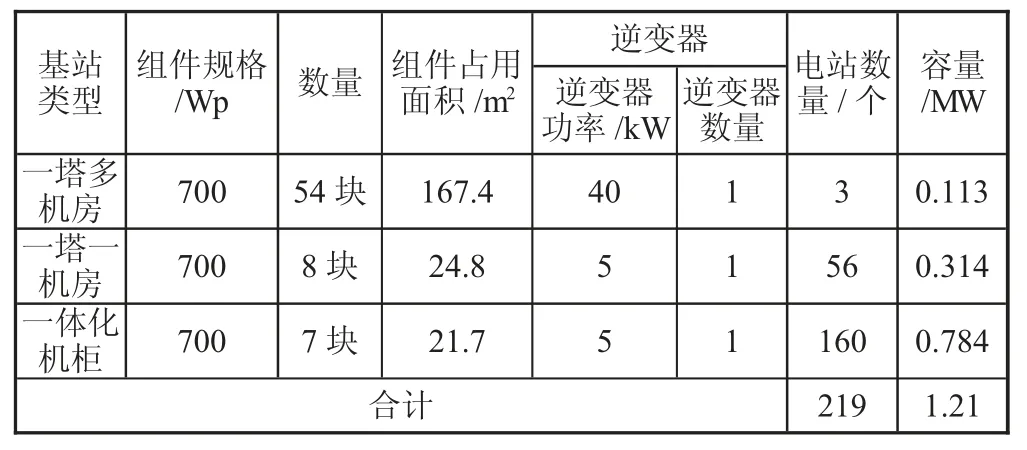 1.3 铁塔基站发电量估算开发利用可再生能源是国家能源发展战略的重要组成部分,太阳能光伏发电站的建设有利于促进当地电网的电源结构调整,优化资源的合理配置,可以对地区局部气候环境的改善起到一定的促进作用。通过现场勘察,安徽省淮南市田家庵区1 027 座铁塔通信基站中,219 座通信基站具备建设光伏电站的现场条件,基站类型分为一塔多机房、一塔一机房、一体化机柜三种类型,每一种类型基站的布局基本相同。本项目总规划容量为1.21 MW,采用每个基站单点接入的并网方式,各基站安装规模如表2 所示。