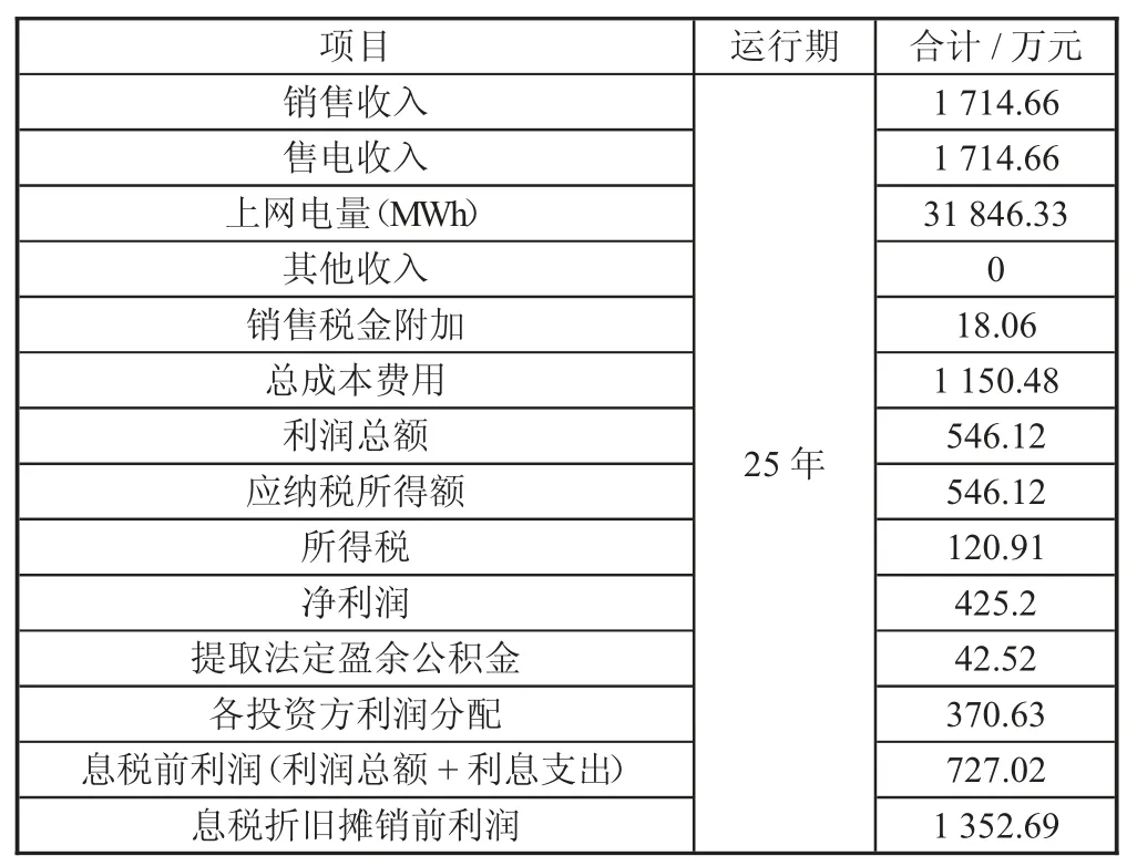 2)财务分析显示(电价按0.608 4 元/kW·h 计算):税后投资内部收益率为5.81%,税后资本金内部收益率为7.24%,投资回收周期为13.79 年,总投资收益率为4.13%,项目资本金净利润率为8.05%。因此,该项目的资本金内部收益率>基准收益率,本项目的实施可以实现显着的经济效益,具体经济效益如表3所示。