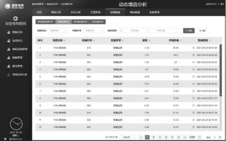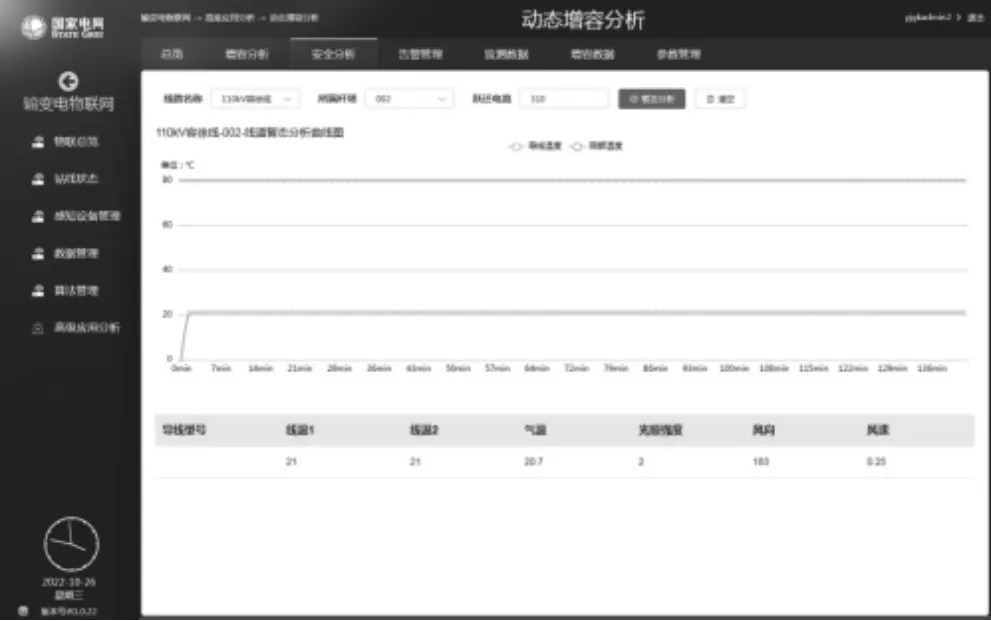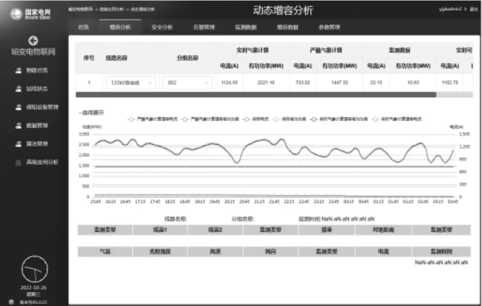2.2 增容分析根据用户需求,实时展示某线路增容监测点的各参数监测数据,系统具备即时数据回传请求功能,可实现实时的线路增容信息采集功能,直观的显示线路的负荷、温度、环境信息、导线弧垂和实时载流量等,建立输电线路数据库,为输电线路的运行维护、输送负荷调整、电网调度等工作提供数据支持,最终达到提高输电线路输送能力的目的。如图6 所示。