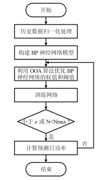 图2 为基于OOA 优化BP 神经网络的光伏发电功率预测模型。ε 为人为规定的误差,N为训练步骤,当误差小于设定误差或达到最大训练步骤时,输出功率。