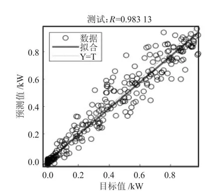 图4 为运用OOA-BP 神经网络预测模型的拟合程度曲线。由图4 可以看出,线性系数为0.983 13,拟合曲线与理想曲线基本重合,这说明预测数据的拟合程度较高,效果较好。