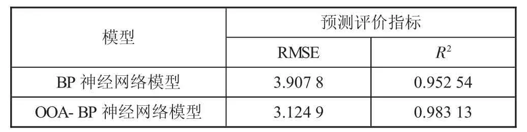 2.4 结果对比BP 神经网络与OOA-BP 神经网络模型中取相同参数进行对比,两种模型预测评价指标见表1。