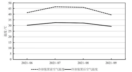 4 离心式空压机进气预处理节能优化经济性分析某制氧企业为了提高设备利用率,在2020 年9月对空压机进行改造。在2021 年夏季,对进气端空气温度检测,冷却装置应用前后空气温度(每月平均值)对比如图3 所示。