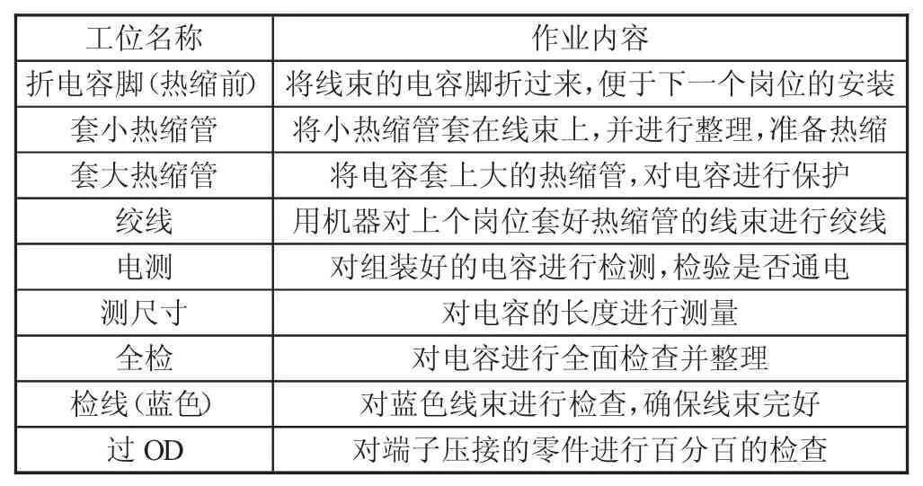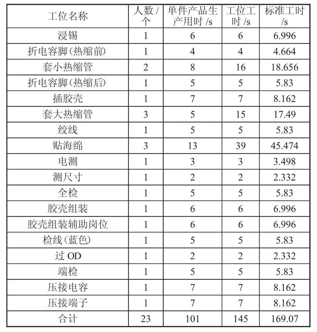 1.2 生产线现状分析该产线生产的产品是PSS,主要原料有胶壳、热缩管、线束、海绵等。PSS 组装线工艺流程为:压缩电容→检线→浸锡→折电容脚→套热缩管→胶壳组装→过OD→折电容脚→插胶壳→套热缩管→绞线→贴海绵→测尺寸→全检。