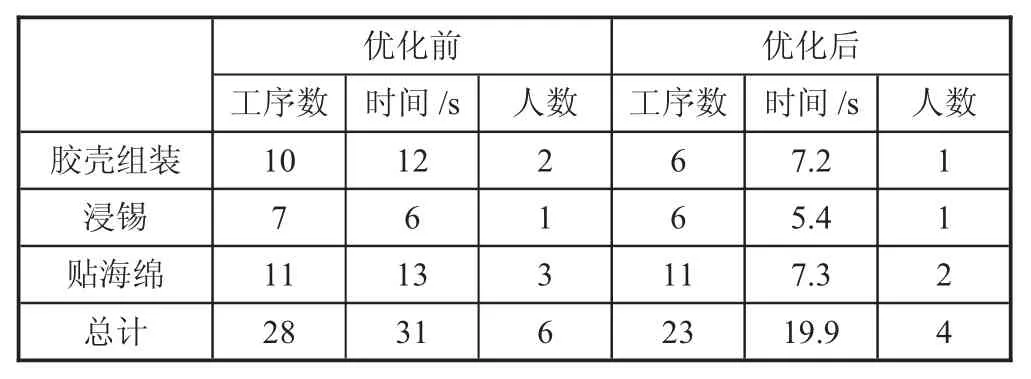 2)通过作业内容对工序调整后,对贴海绵工位以及其他存在问题的工位进行动作分析,对胶壳组装、贴海绵、浸锡操作过程进行详细拆分,依据动作经济原则,消除不必要动作,根据动作分析中得出的结论,还对工位器具和物料摆放进行了优化,有效动作比得到改善,提高了双手的协同率,减少了作业时间,使生产节拍也有所降低。最终将该产线的节拍降至7.3 s,相比于一开始13 s 的生产节拍,取得了很大的成效。
