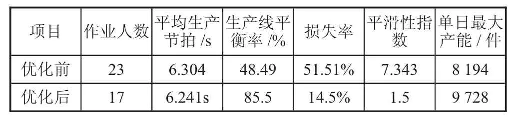 3 结论1)在优化过程中,根据作业内容和作业时间,运用ECRS 原则对工序进行调整,首先判断每个工位是否有必要存在,然后合并作业节拍较短的工位,对操作台布局进行重新布置。通过作业调整,使生产节拍达到初步平衡,PSS 组装线的生产线平衡率也得到了一定程度的提高。