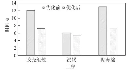 由表4 可知,胶壳组装优化后工序数减少4 道,组装时间减少了4.8 s,优化掉1 人,浸锡过程优化后工序数减少1 道,作业时间减少了1.6 s,但是可以同时进行两个线束的浸锡,贴海绵工序数未减少,作业时间减少6.7 s,优化掉1 人,总工序减少5 道,总作业时间减少11.1 s,总人员数减少2 人。工序数优化前后对比见图6 所示,时间对比如图7 所示,可以明显地看出改善的有效性。