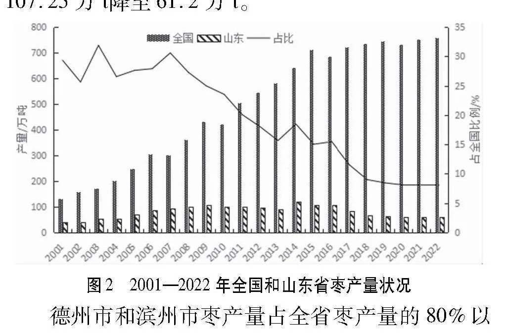 2001—2022年为全国枣产业全面发展期[12],枣产量持续增加,但对于山东省枣产业则是由盛转衰期。2000年山东省枣栽培面积18万hm2,产量35.5万t,分别为全国面积和产量的26.6%和27.5%,居全国第二位[12],到2010年山东省枣栽培面积减为17万hm2[13],产量却增至近100万t(鲜枣),占全国的22.3%(图2)。为实现干果(含枣)产业健康发展,山东省政府于2010年印发了《关于实施蔬菜等五大产业振兴规划的指导意见》(鲁政发[2010]81号),明确提出到2015年,全省干果面积发展到50.7万hm2,改造低产低效果园13.3万hm2,良种化率达到70%以上,标准化生产面积达到85%以上,干果产量达到100万t,产值150亿元的发展目标[17]。借助政策扶持,于2014年山东省枣产量增长至近120万t,但占全国产量仍降至18.5%。2015年至今产量持续降低,2019年产量仅63.3万t,占全国产量的9%[18-20],2020年产量下降到59.2万t(表1)。为振兴山东省枣产业,2020年山东省农业农村厅下发《山东省枣产业发展指导意见》,从品种、栽培、市场主体、精深加工和食品安全等方面给予具体指导[1]。山东省科技厅也将枣列入山东省农业良种工程经费支持序列[21],但2021年和2022年产量并未提高,占全国的比重也一直下降。