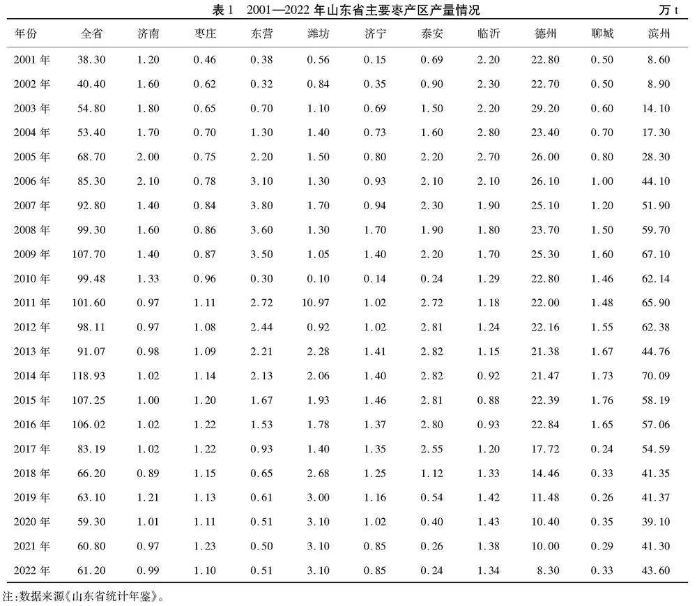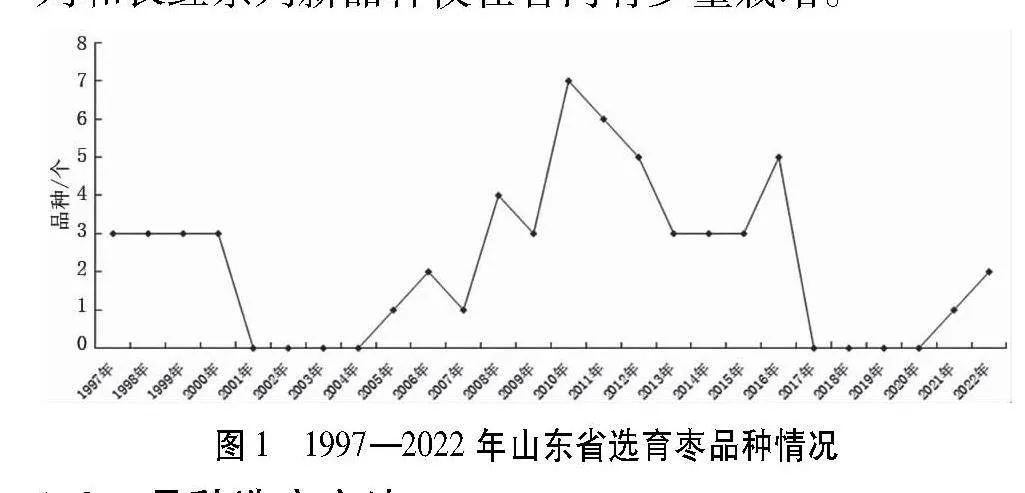 枣已成为当地农村经济发展的重要支柱产业,在推进全省林业生态建设和乡村振兴中发挥着重要作用[1]。枣果实具有重要的食用和药用价值[2],素有“铁杆庄稼”“木本粮食”之称,深受消费者青睐[3,4]。随着人们生活水平的提高,对果品营养价值及保健功效越来越重视,对优质枣果的需求量越大[5]。随着国家干制枣产区的整体西移,山东省枣产区急需进行发展战略转变以应对未来市场。笔者对山东省枣产业在品种选育、产量变化、栽培模式和产品加工方面的发展情况进行总结和分析,为枣产业决策部门制定规划和决策、实行宏观调控提供科学依据。