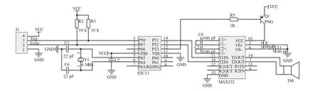 语音模块采用WT588D芯片,芯片内嵌DSP高速音频处理器,具有处理速度快、抗干扰能力强、音质好等优点[3]。芯片与扬声器相结合并通过单片机的P3.0、P3.1、P3.2、P3.3、P3.4 口输入电信号使其正常工作(电路如图1所示)。