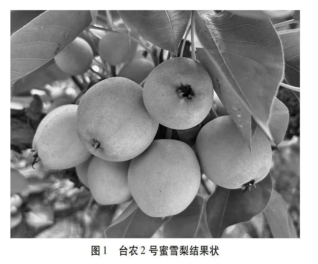 台农2号蜜雪梨通常在2月中旬现蕾,3月上旬初花期,3月中旬盛花期,7月中下旬果实成熟。叶片宽大,叶色深绿,树势健壮。在天气好时结实率较高,花序坐果率85%~95%,花朵坐果率15%~25%。长、中、短果枝均可坐果。果实呈高桩近圆形,平均单果重285 g,果皮褐绿色,采摘后逐渐转为浅黄色(图1)。果肉洁白,汁多味美,口感细嫩爽脆,果心较小,可溶性固形物含量11%~13%,成熟果实散发蜜香味。3年生树666.7 m2产量为200 kg,5年生树产量1 000 kg,10年生树产量达2 500 kg。