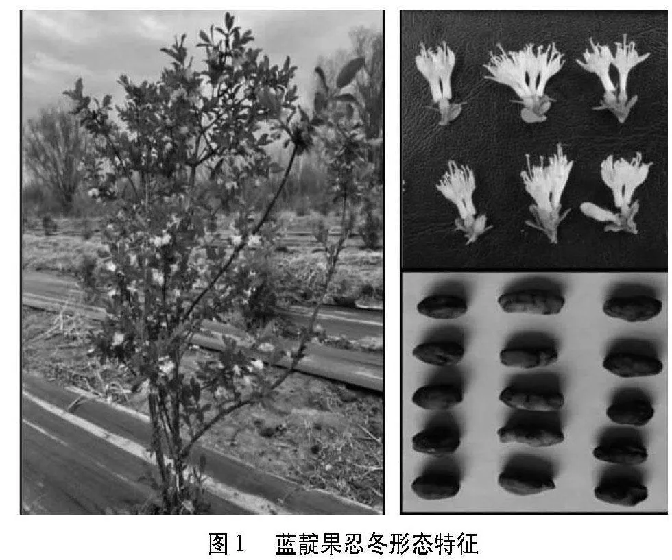 蓝靛果为多年生落叶灌木,呈丛状,主干不明显,株高1~2 m。主根较短,侧根发达。叶矩圆形或椭圆形,叶柄短。花双生,花冠黄白色,筒状漏斗形。浆果椭圆形或长圆形,蓝黑色,皮薄多汁(图1)。
