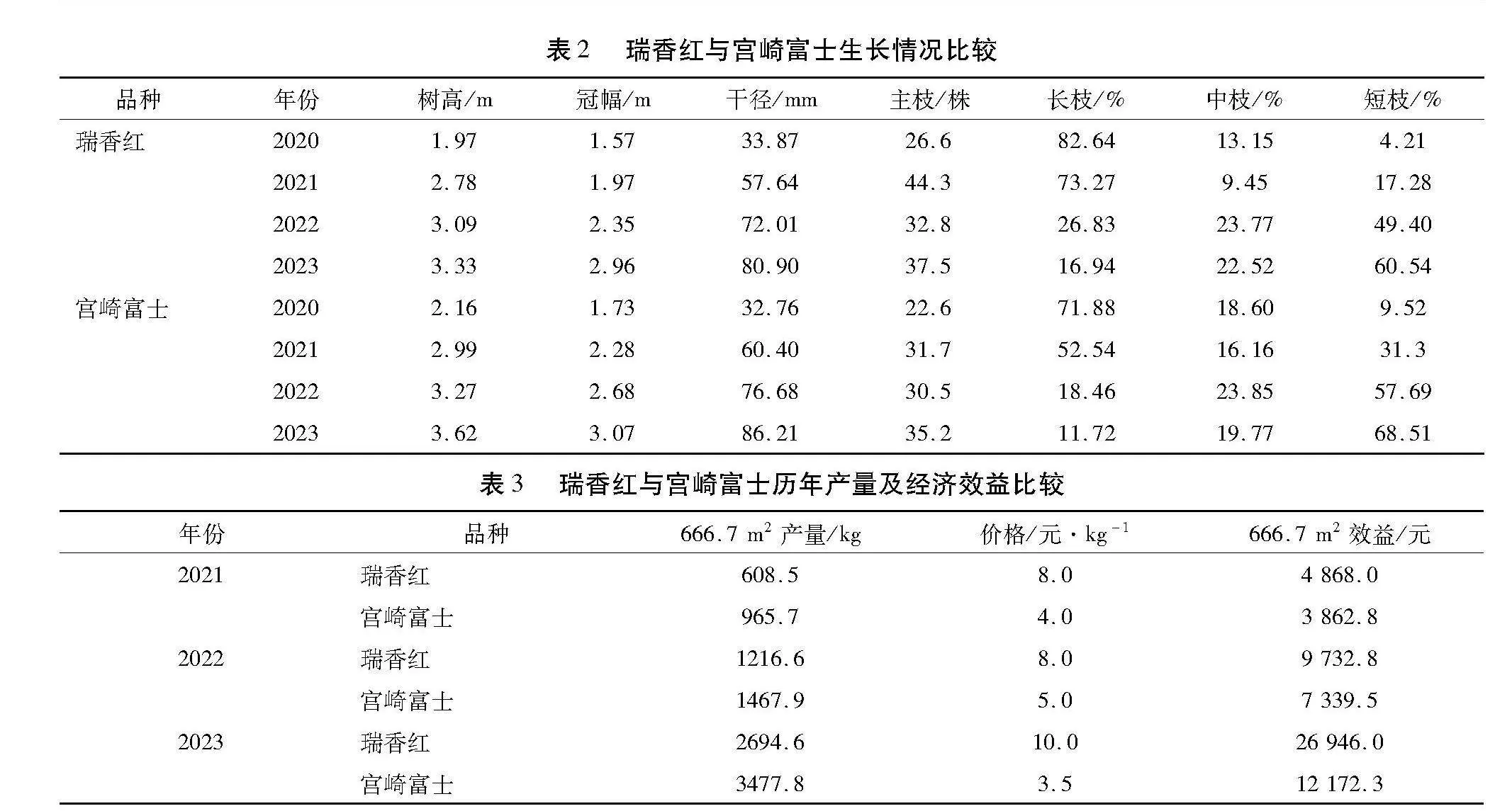 瑞香红初果期以腋花芽结果为主,随着树龄增大逐渐以中短枝结果为主,连续结果能力强。成龄树长、中、短枝和腋花芽都可结果。5年生树平均主枝数37.5个,短果枝占60.54%。瑞香红属长枝型品种,早果性丰产性好,幼树定植后第2年少量成花。第3年有部分产量,第4年666.7 m2产量1 216.6 kg,第5年进入盛果期,666.7 m2产量2 694.6 kg。高接树一般第2年即可正常结果,3年后进入盛果期。瑞香红苹果在商丘地区无采前落果、大小年现象,稳产性好。宫崎富士有大小年现象。瑞香红产量稍低于宫崎富士。收购价8~10元/kg,高于宫崎富士。瑞香红丰产稳产,多年连续效益高于宫崎富士(表3)。