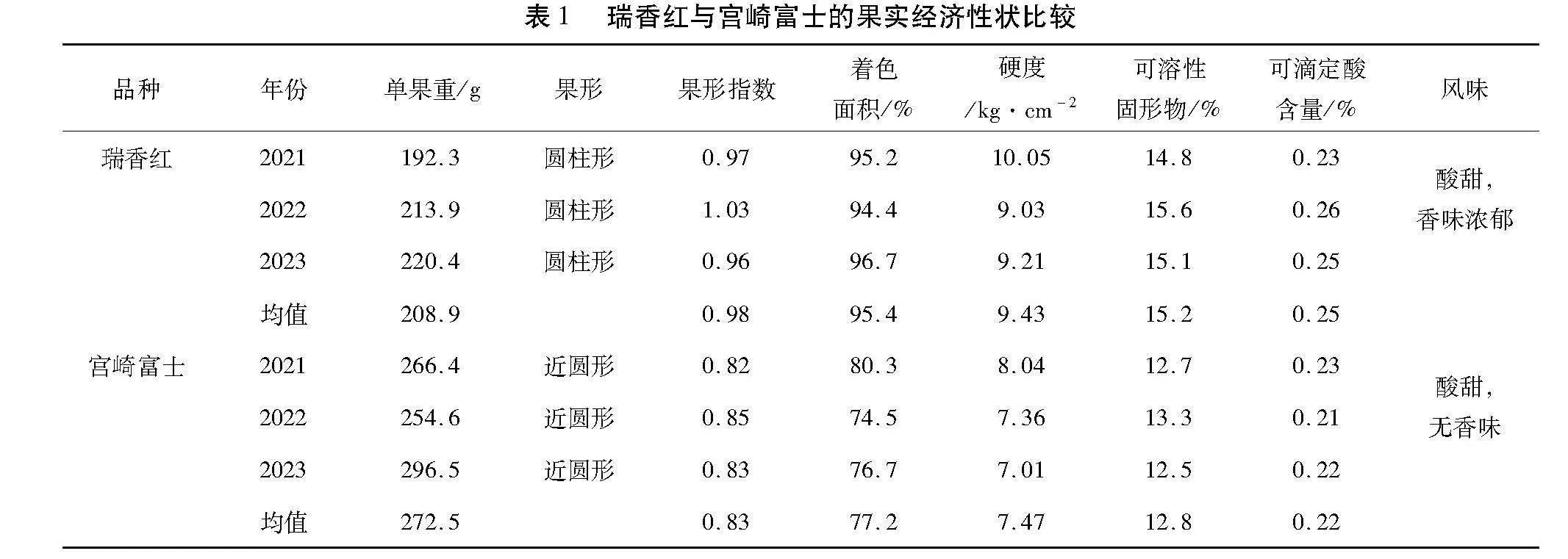 与对照品种宫崎富士相比(表1),瑞香红着色好,果形指数高,硬度大,可溶性固形物含量高,香味浓郁。
