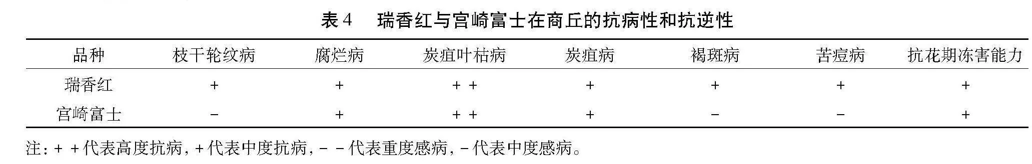 通过在商丘地区连续5年对瑞香红抗逆性和抗病性观察(表4)知,瑞香红苹果适应商丘地区的生态条件,抗严寒,春季未出现抽条现象。耐旱涝、耐盐碱。对炭疽病、褐斑病具有较强的抗性。瑞香红虽有金冠苹果的遗传基因[7],但高抗苹果炭疽叶枯病,连续多年未发现发病植株。亦未发现明显生理性病害。