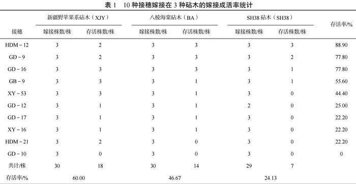 接穗HDM-12在3种砧木上总的存活率最高,为88.90%,其次为GD-9、GD-16,存活率为77.80%,表明HDM-12、GD-9和GD-16比较适合以上3种砧木嫁接保存;接穗GB-9、XY-53、GD-12、HDM-21、XY-16和GD-17在3种砧木上的存活率为55.6%~22.20%,可以适当考虑选用以上3种砧木嫁接保存;接穗GD-10无存活,说明GD-10不适合通过以上3种砧木嫁接保存。