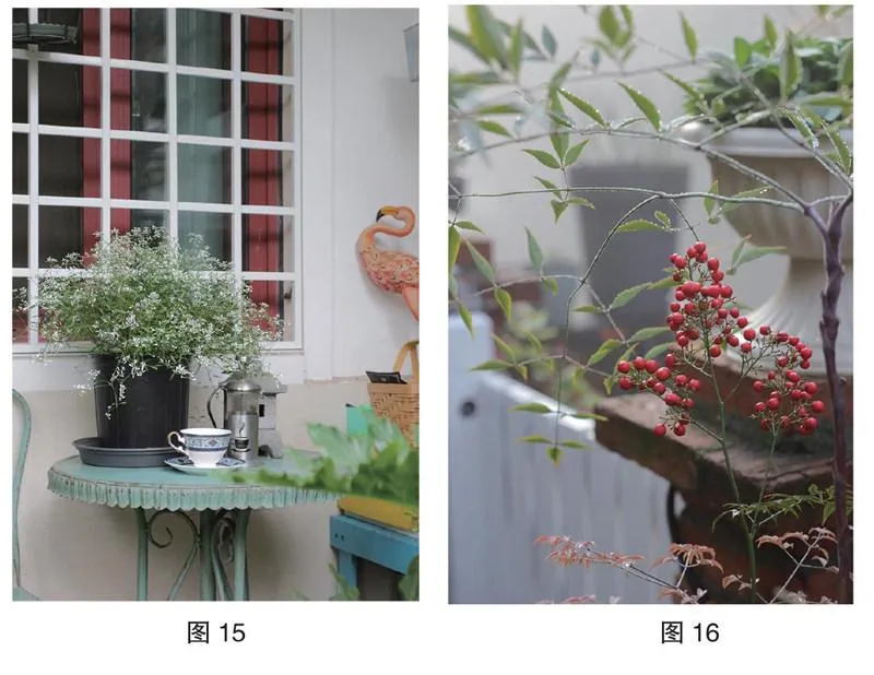 过完了春夏,花园渐渐有了秋意,花园里繁华不再。此时开花的植物不多,禾叶大戟的花期正是秋末冬初,但是由于枝叶有轻微毒性,不能搬进室内观赏。我一般会搬到阳台桌面上,温暖的阳光中用漂亮的茶盏泡一杯清茶,禾叶大戟细碎的白色小花缀满了枝头,一眼望去便是喜欢的风景(图15)。