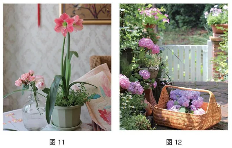 夏季的花园是蓬勃热闹的,花园里鸟啼蝉鸣,清风带来阵阵荷香。五月正是绣球开花的季节,每天打开院门,眼前就是一幅花团锦簇、色彩缤纷的图画。绣球的盆栽不适合搬进室内,不妨剪几枝绣球插进花瓶,绚丽的色彩会让整个居室变得华丽起来。除了绣球插花,最适合搬进室内的盆栽品种是朱顶红。不同的朱顶红品种花期不同,可以根据花期先后将朱顶红盆栽搬进室内,有了几盆朱顶红的装饰,使居室里充满了浪漫色彩(图10-12)。