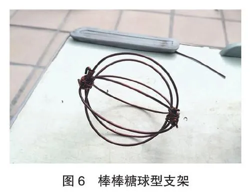 然后把支架插入花盆(图9),调整景天叶澳地肤的位置,让整棵植株依靠在支架上,用1.0毫米的铝线缠绕在主体结构上,再慢慢把缺光徒长的枝条盘绕在棒棒糖球体支架上(图10),一点点地盘,借着球体的弧度轻轻牵引枝条,最后全部用1.0毫米铝线固定(图11)。
