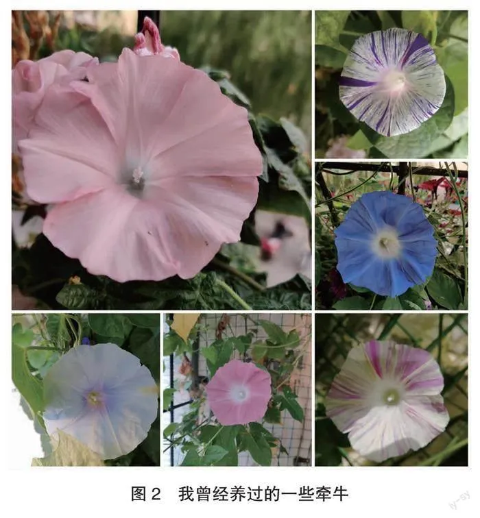 牵牛是旋花科番薯属一年生草本,和地瓜是亲戚。它最大的特点就是“顺杆儿爬”——缠绕茎会顺着任何直立物体向上攀延。牵牛耐贫瘠耐高温不耐寒冷,一般来说0℃不能过冬。它的花朵于夏日清晨绽放又很快凋谢,花期只有几个小时。隔海相望的日本人被这种转瞬即逝的美丽所打动,为其取名“朝颜”。现在播种繁殖的颜色各异的品种牵牛花也大多都是日本通过杂交选育出的后代(图2)。