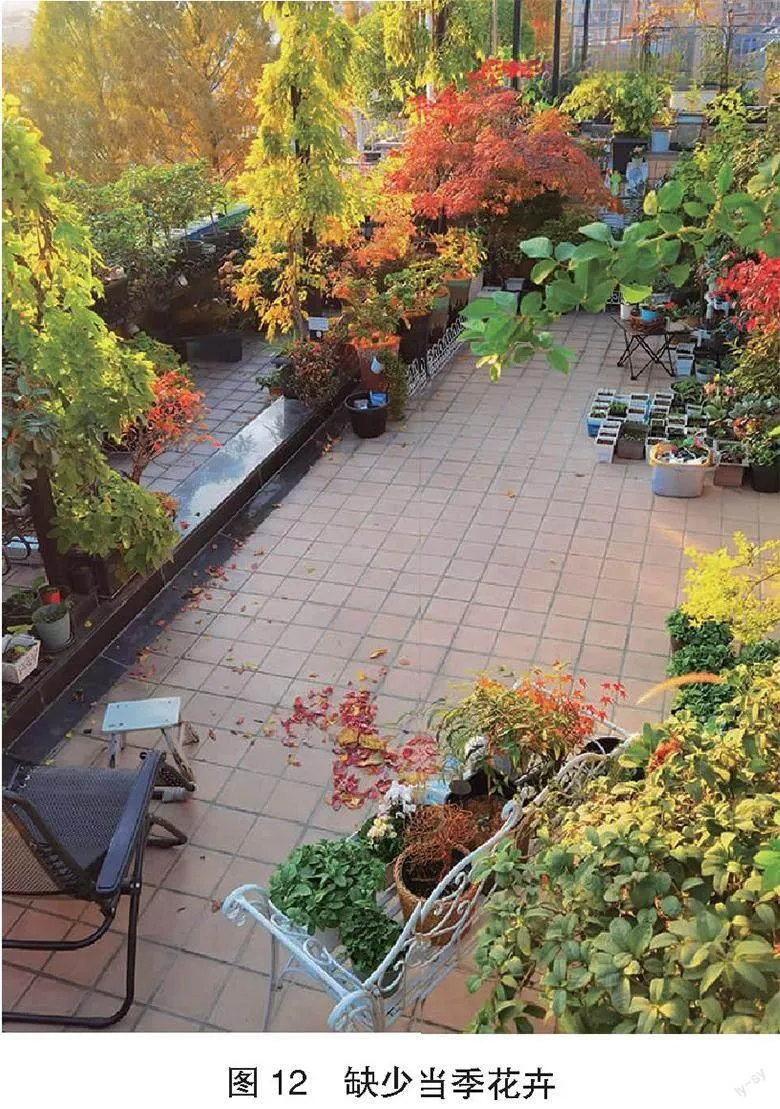 2023年从10月开始到12月,整个年底,我都特别忙碌,为了弥补疫情三年没法好好赏秋的遗憾、为了欣赏杭州举办亚运进行的城市绿化新提升、为了品味杭城每一处花海和花展、为了赶时间进行秋播迎接明年春季的盛花……工作之余,作为一个园艺园林爱好者,我把自己的时间安排得满满当当,然后回过头才发现,自己的时间和精力已经不足以打造今秋的繁花胜景,我的露台缺少了当季草本花卉的点缀(图12),完完全全就是靠木本的叶子撑起了秋天。但这好像,也没什么问题,红叶也可以美得如梦似幻,黄叶也可以耀眼如星辰,我内心的充足和快乐依旧在跳跃起飞。今年是个暖冬,进入12月了,气温竟然依旧在20 ℃左右徘徊,晴天也格外持久,往年这会儿的杭州总是阴雨连绵,我家的紫藤今年的黄叶也来得特别迟(图13),好像也想把秋色保持得更久一些。