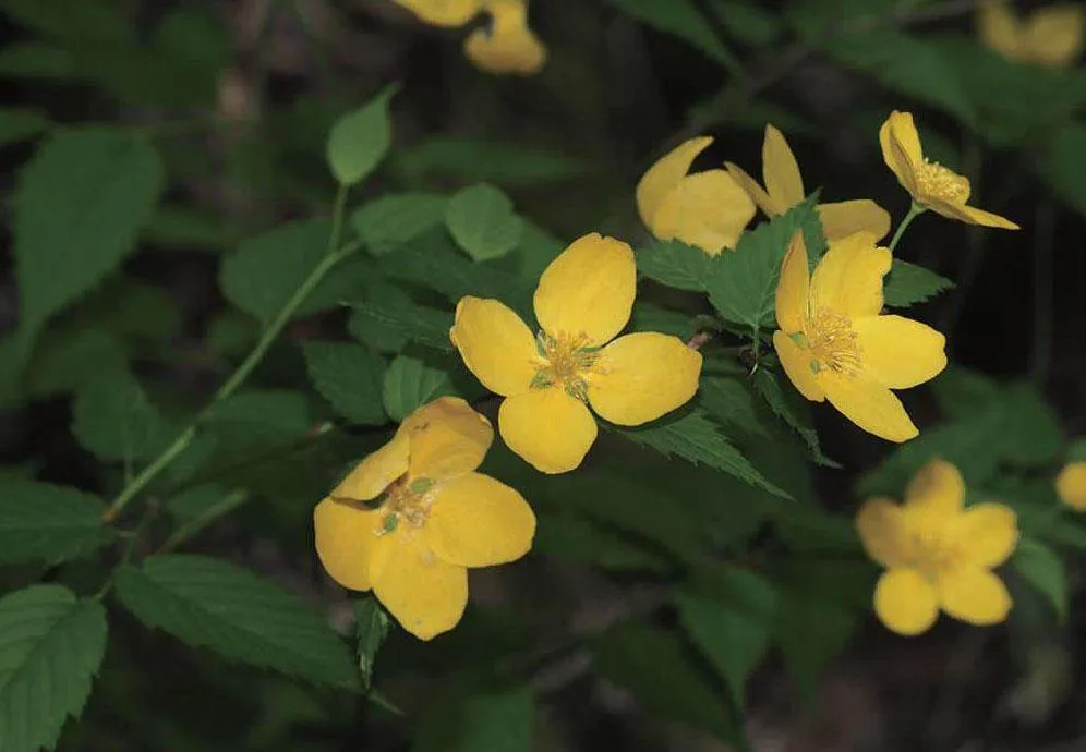 蔷薇科棣棠花属落叶灌木,高1~2米。叶互生,三角状卵形或卵圆形,边缘有尖锐重锯齿。单花,花瓣黄色,宽椭圆形。瘦果。花期4-6月,果期6-8月。