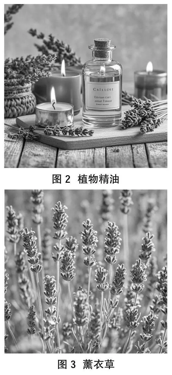芳香疗法主要通过由植物材料萃取的精油和植物材料释放的香气两种物质开展。植物精油(图2)主要通过按摩、熏香等方式,被人体皮肤或呼吸道吸收。例如,在治疗牙齿时应用植物精油熏香可以缓解紧张和焦虑,通过薰衣草(图3)芳香疗法缓解动脉静脉穿刺的疼痛等。而芳香植物材料方面主要是通过种植芳香植物专类园或混播芳香植物与常绿植物,将芳香植物的景观功能和挥发物质的疗愈功能相结合,其研究成果具有较高的实用性。
