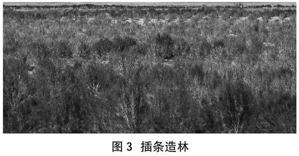 枝条移植前需经历一系列加工,通过水浸作业提升其水分含量及耐旱性能。土壤含水量及插条长度共同影响插深,常绿树插穗埋深宜达其长度的2/3或更深,适宜土壤水分的造林地,其落叶树种地表保留高度宜为5~10cm。春秋之际是栽植插条造林的黄金时段,土壤状况恰到好处,促进插条生根存活,造林插条普遍存活率高达98%以上,大幅减少造林开支,按照2m长度规格进行换算,每株植物可分出数段枝丫,造林投入仅为栽植苗木费用的约1/15。插条造林如图3所示。