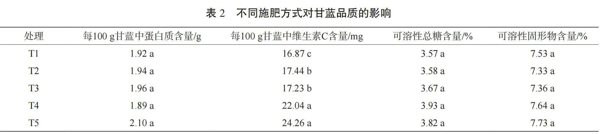 于2022年9月2日甘蓝成熟期,从各小区中采集5株具有代表性的甘蓝,烘干后,测定甘蓝品质,具体指标包括蛋白质含量、维生素C含量、可溶性总糖含量及可溶性固形物含量。其中,甘蓝蛋白质含量用凯式定氮法测定,维生素C含量用2,6-二氯酚靛酚滴定法测定,可溶性总糖含量用原子吸收分光光度法测定,可溶性固形物含量用折光仪法测定。