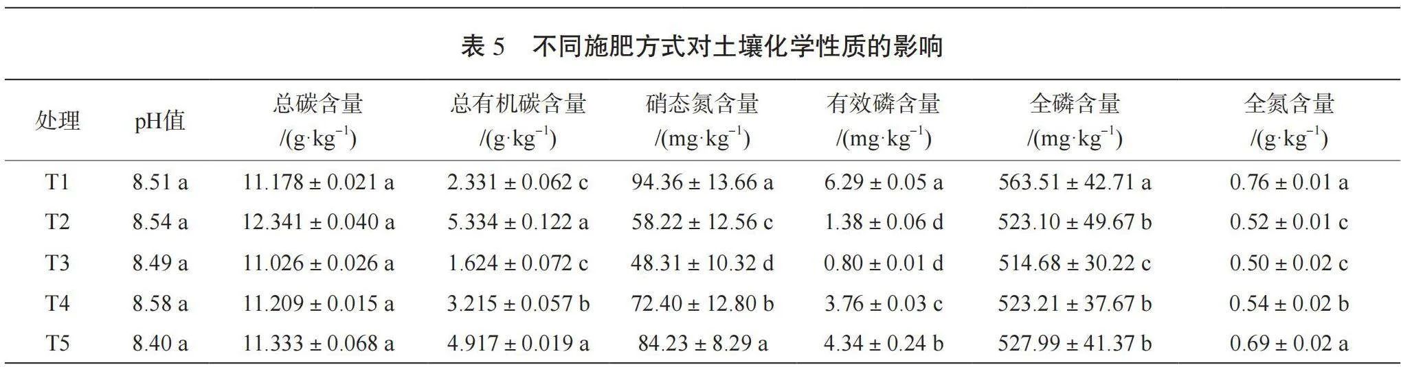 由表5可知,各处理土壤pH值为8.40~8.58,各处理无显著差异;T2处理土壤总碳含量最高,为12.341 g·kg-1,与其他处理无显著差异;T2处理土壤总有机碳含量最高,为5.334 g·kg-1,与T5处理无显著差异,与其他处理差异显著;T1处理土壤硝态氮含量最高,为94.36 mg·kg-1,与T5处理无显著差异,与其他处理差异显著;T1处理土壤有效磷含量最高,为6.29 mg·kg-1,与其他处理差异显著;T1处理土壤全磷含量最高,为563.51 mg·kg-1,与其他处理差异显著;T1处理土壤全氮含量最高,为0.76 g·kg-1,与T5处理无显著差异,与其他处理差异显著。