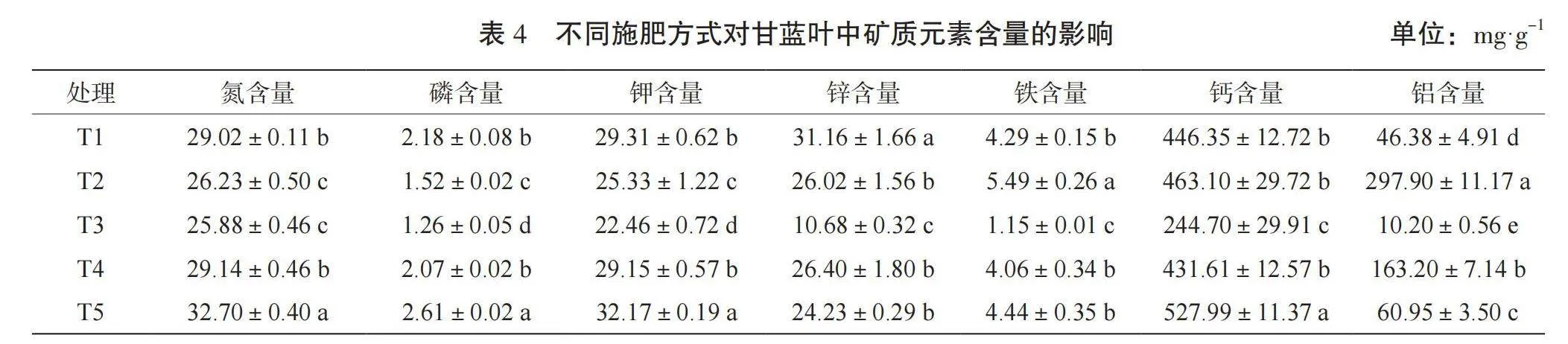 由表4可知,T5处理甘蓝叶中氮、磷、钾含量最高,为32.70 mg·g-1、2.61 mg·g-1、32.17 mg·g-1,均与其他处理存在显著差异;T1处理甘蓝叶中锌含量最高,为31.16 mg·g-1,与其他处理存在显著差异;T2处理甘蓝叶中铁含量最高,为5.49 mg·g-1,与其他处理存在显著差异;T5处理甘蓝叶中钙含量最高,为527.99 mg·g-1,与其他处理存在显著差异;T2处理甘蓝叶中铝含量最高,为297.90 mg·g-1,与其他处理存在显著差异。
