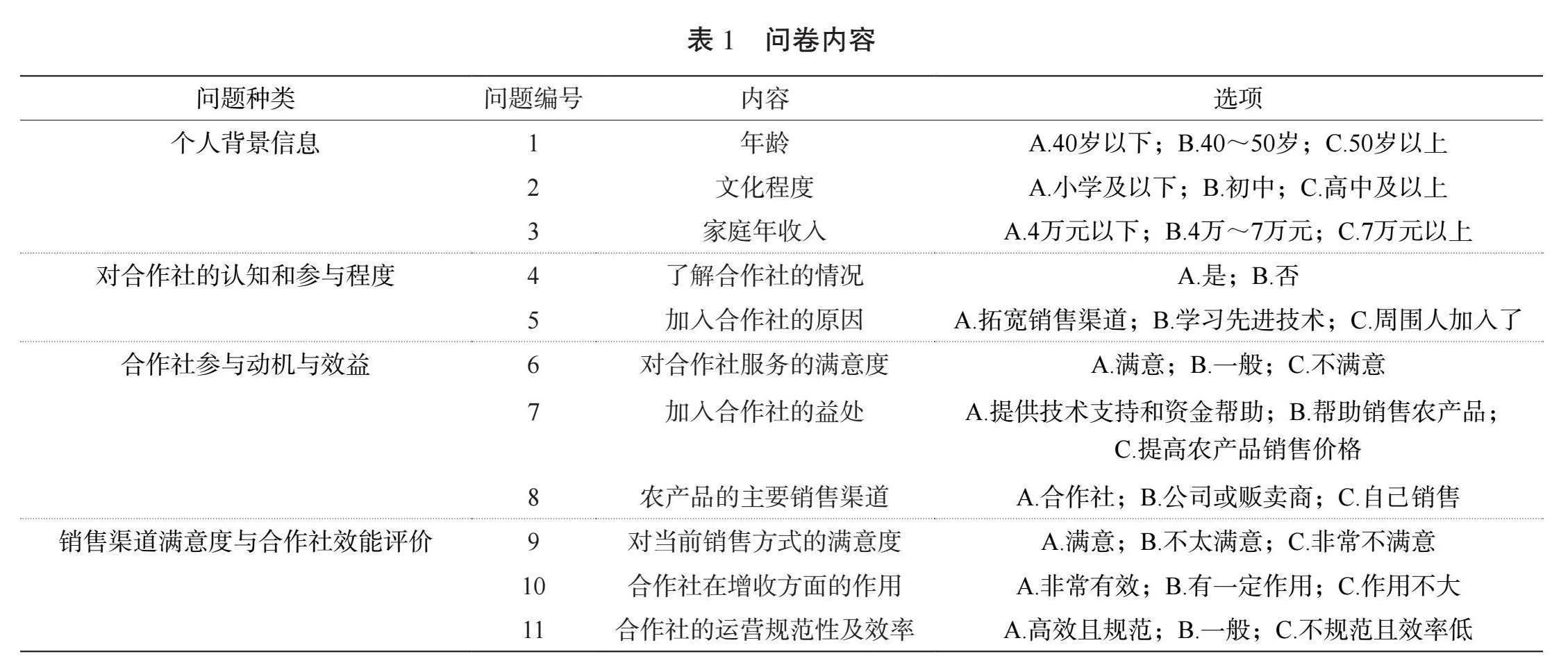 从个人背景信息、对合作社的认知和参与程度、合作社参与动机与效益、销售渠道满意度与合作社效能评价等方面设计问卷,具体问卷内容如表1所示。