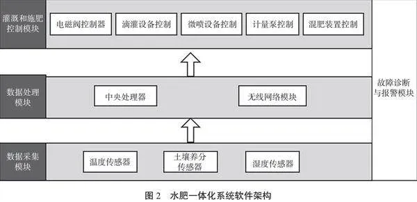 水肥一体化系统软件设计主要包括数据采集模块、数据处理模块、灌溉和施肥控制模块及故障诊断与报警模块(见图2)。