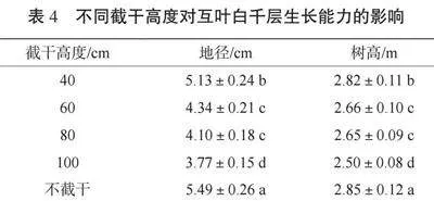如表4所示,截干高度对白千层的地径、树高有显著影响。不截干处理的植株表现最优,地径、树高分别为5.49 cm、2.85 m。截干高度为40 cm的处理次之,截干高度为100 cm的处理表现最差。这表明截干高度过高会限制萌芽点的发育空间,影响枝叶的生产能力。