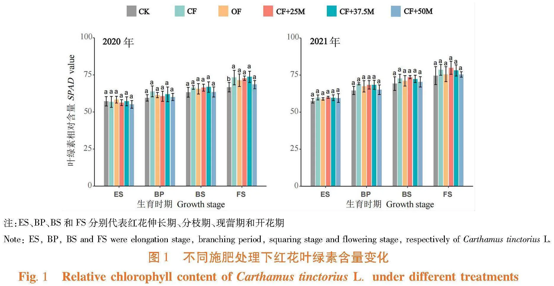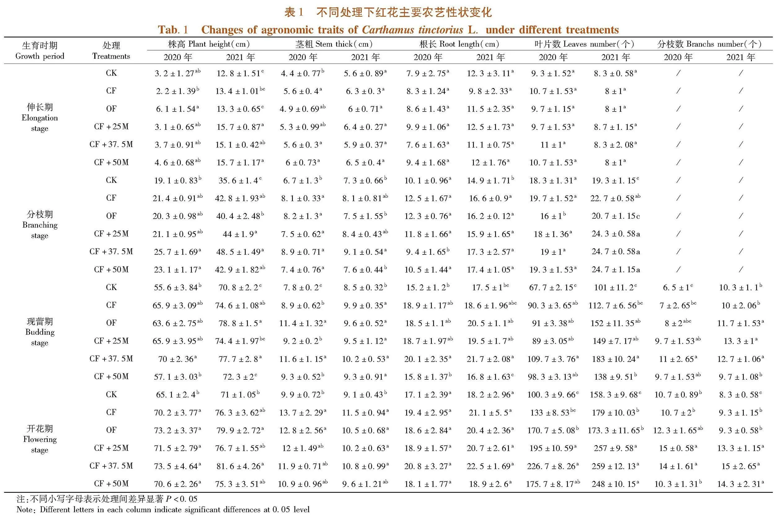 【方法】2020~2021年在新疆塔城地区裕民县设置2年定位施肥试验,采用裂区试验设计,设6个处理:(1)对照CK:不施肥;(2)CF:复合肥20 kg/667m2;(3)OF:微生物菌肥20 kg/667m2;(4)CF+25M:化肥15 kg/667m2(化肥减量25%)+微生物菌肥5 kg/667m2;(5)CF+37.5M:化肥12.5 kg/667m2(化肥减量37.5%)+微生物菌肥7.5 kg/667m2;(6)CF+50M:化肥10 kg/667m2(化肥减量50%)+微生物菌肥10 kg/667m2。研究不同施肥处理对红花农艺性状、干物质积累与分配和产量形成的影响。