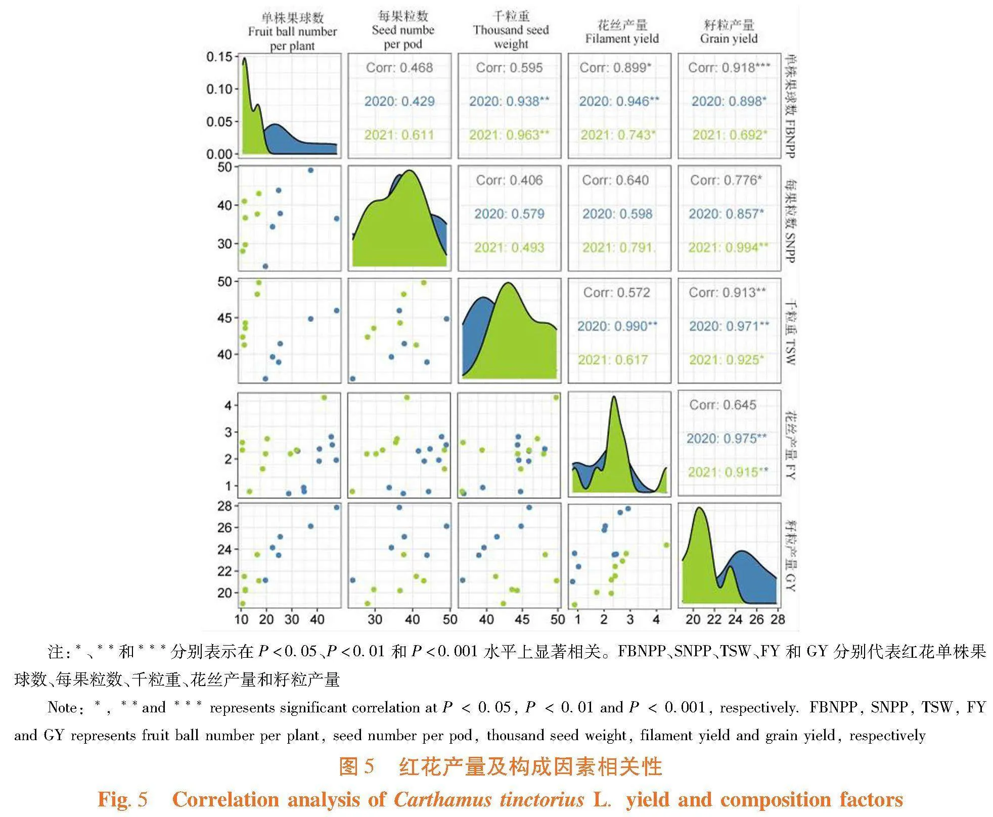 研究表明,不同施肥处理下红花花丝产量与单株果球数显著正相关,籽粒产量与单株果球数、每果粒数和千粒重均呈显著正相关。花丝产量与单株果球数、千粒重和籽粒产量均呈显著正相关,但经过校正后,仅与单株果球数呈显著正相关;籽粒产量与单株果球数、每果粒数、千粒重和花丝产量均呈显著正相关,经过校正后,与单株果球数和千粒重均极呈显著正相关,与每果粒数显著正相关,产量构成因素对籽粒产量的影响大小为单株果球数gt;千粒重gt;每果粒数。在红花生产中促进红花单株果球数、千粒重和每果粒数的形成,有利于产量提高。图5