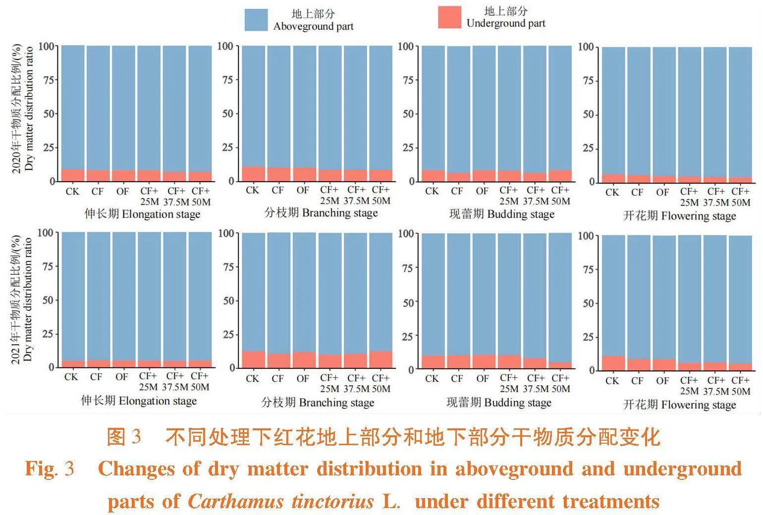 研究表明,施肥对红花地上部分和地下部分干物质分配比例有一定的影响,不同施肥处理下红花干物质积累以地上部分为主,地上部分干物质积累量占总积累量的90%以上,并且所有施肥处理下红花地上部分干物质分配比例均大于CK。随着生育进程的推进,伸长期和分枝期不同处理下红花干物质分配比例无显著差异。现蕾期至开花期红花植株生长逐渐成熟,地上和地下部分干物质分配比例趋于稳定,不同化肥减量配施微生物菌肥处理下,红花地上部分干物质分配比例均高于CF处理,分配比例表现为CF+50Mgt;CF+37.5M和CF+25Mgt;OF和CF。化肥适当减量配施微生物菌肥可促进红花光合产物向地上部分输送,但化肥过量配施微生物菌肥则抑制红花地下部分生长而影响植株的生长和产量形成。图3