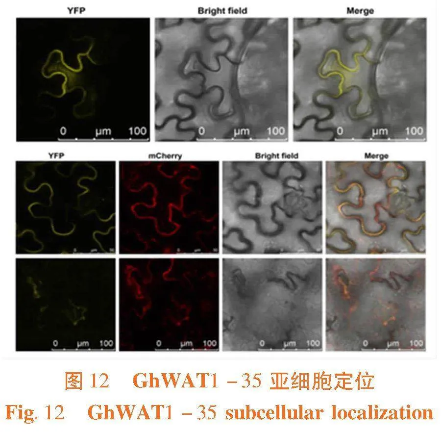 研究表明,推测GHWAT1-35蛋白定位于细胞质膜。将构建的GHWAT1-35基因与pC1300-35S-YFP载体重组,并将其瞬时转化到烟草细胞中,该基因在细胞核中无表达,呈现光滑的连续信号,可能定位于细胞膜。加膜marker共同注射后观察,加入膜marker并进行质壁分离后,35S∷GhWAT1-35-YFP信号和mCherry的红色信号一样质壁分离后内缩进胞内;而未质壁分离时35S∷GhWAT1-35-YFP信号和mCherry信号基本吻合。GhWAT1-35定位于细胞质膜。图12