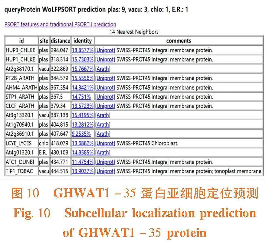 GHWAT1-35基因定位于细胞质膜上,与前人研究拟南芥At1g01070基因的亚细胞定位结果一致[8]。