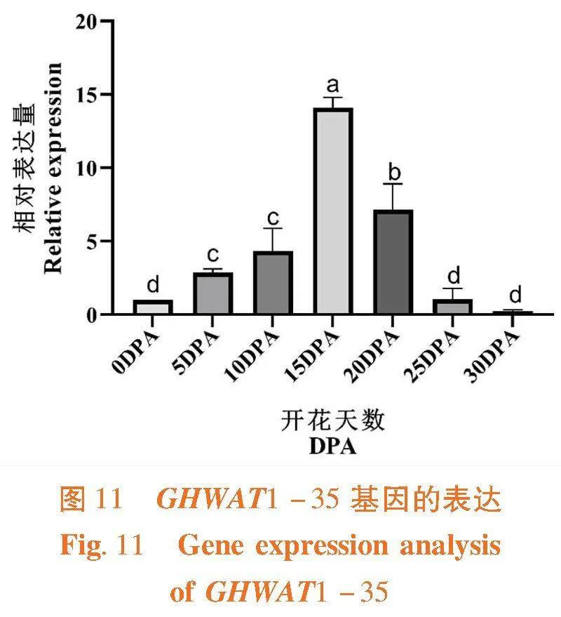 研究表明,检测基因在开花后0、5、10、15、20、25和30 DPA的纤维组织的表达水平。在开花后不同时期的纤维组织中,该基因均有表达,并且在第15、20 DPA的表达量相对较高,具有显著差异。GHWAT1-35基因可能在棉花胚珠及纤维发育中发挥重要作用。图11