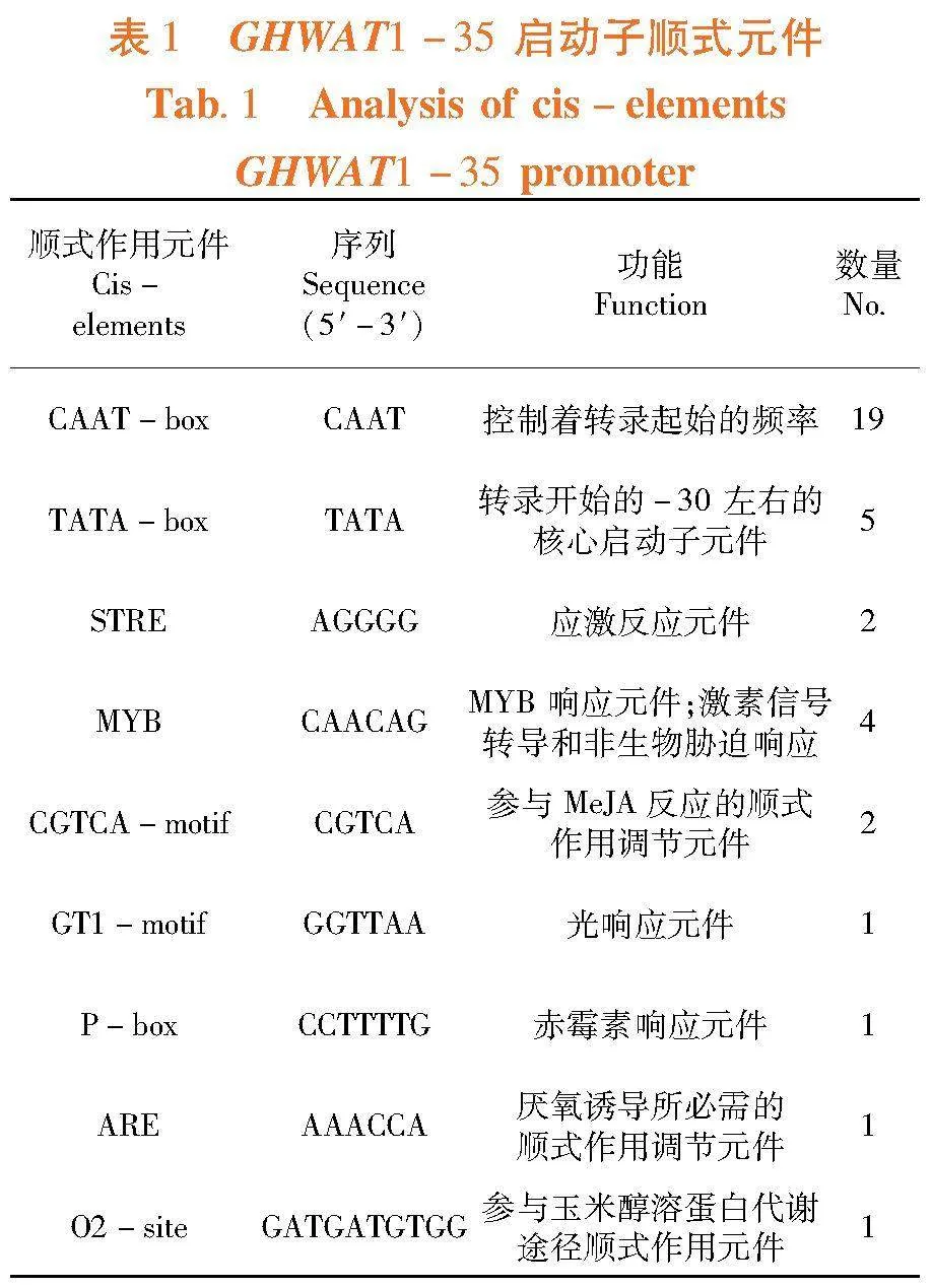 GHWAT1-35拥有CGTCA-motif(参与MeJA反应的顺式调节元件)、MBS(MYB结合位点,干旱诱导响应元件)、GT1-motif(光响应元件)、P-box(赤霉素响应元件)、ARE(厌氧诱导所必需的顺式调节元件、O2-site(玉米醇溶蛋白代谢调节的顺式作用元件)等顺式作用元件。表1